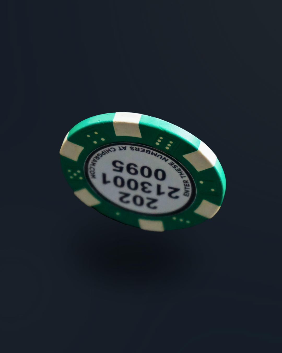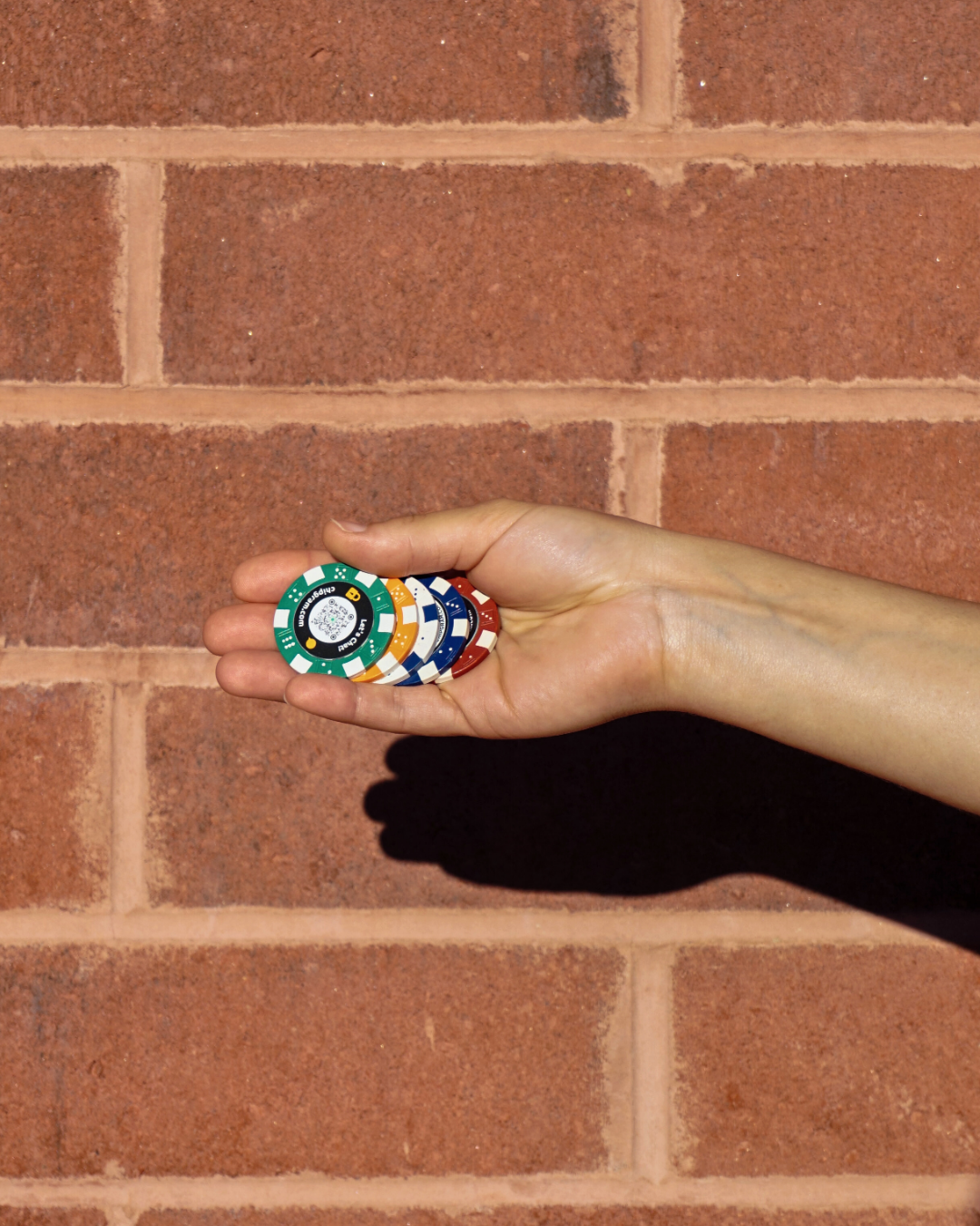 You’ll receive 3 chips of each color (Orange/Green/Red/Blue/White) with our standard greeting message on the front and unique codes on the back. The chips weigh 11.5 grams each.